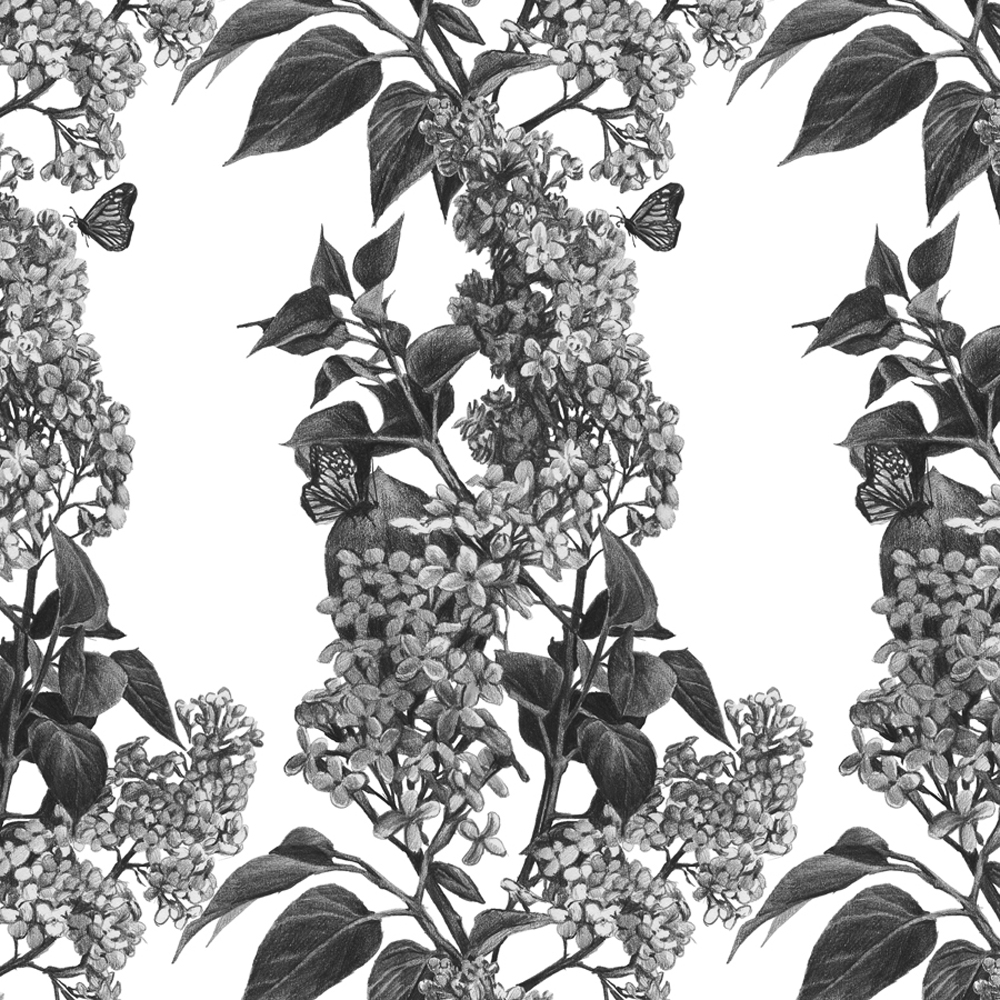 Lilac Bloom Black and White- digital walpaper from hand drawn graphite drawings