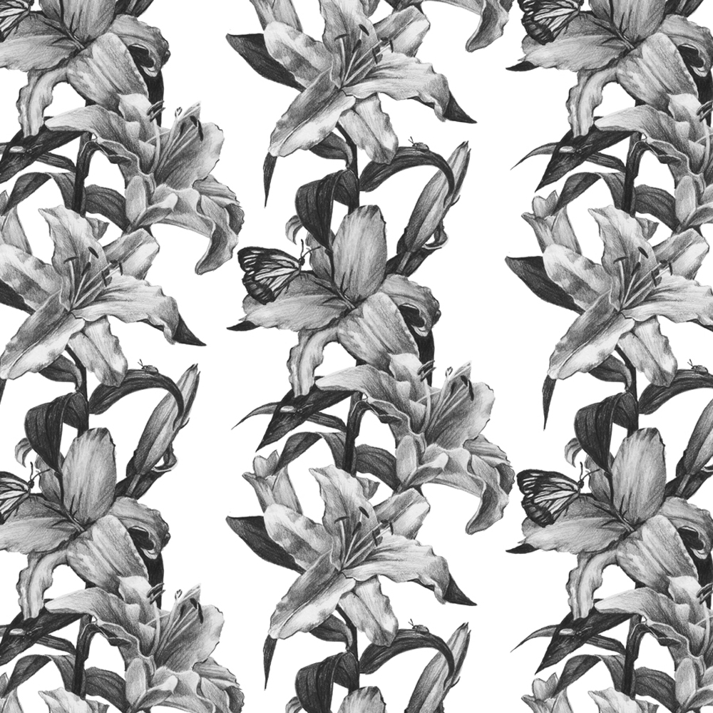 Lilly Bloom Black and White- digital walpaper from hand drawn graphite drawings