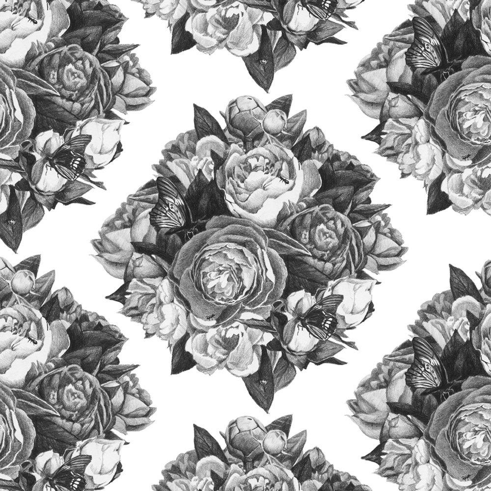 Peony Bloom Black and White- digital walpaper from hand drawn graphite drawings